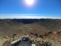 Meteor Crater is a meteorite impact crater approximately 37 miles east of Flagstaff and 18 miles west of Winslow in the northern Arizona desert of the United States. Because the United States Board on Geographic Names commonly recognizes names of natural features derived from the nearest post office, the feature acquired the name of "Meteor Crater" from the nearby post office named Meteor. The site was formerly known as the Canyon Diablo Crater and fragments of the meteorite are officially called the Canyon Diablo Meteorite. Scientists refer to the crater as Barringer Crater in honor of Daniel Barringer, who was first to suggest that it was produced by meteorite impact. The crater is privately owned by the Barringer family through their Barringer Crater Company, which proclaims it to be "best preserved meteorite crater on Earth". Despite its importance as a geological site, the crater is not protected as a national monument, a status that would require federal ownership. It was designated a National Natural Landmark in November 1967. Meteor Crater lies at an elevation of about 1,740 m above sea level. It is about 1,200 m in diameter, some 170 m deep, and is surrounded by a rim that rises 45 m above the surrounding plains. The center of the crater is filled with 210–240 m of rubble lying above crater bedrock. One of the interesting features of the crater is its squared-off outline, believed to be caused by existing regional jointing in the strata at the impact site.